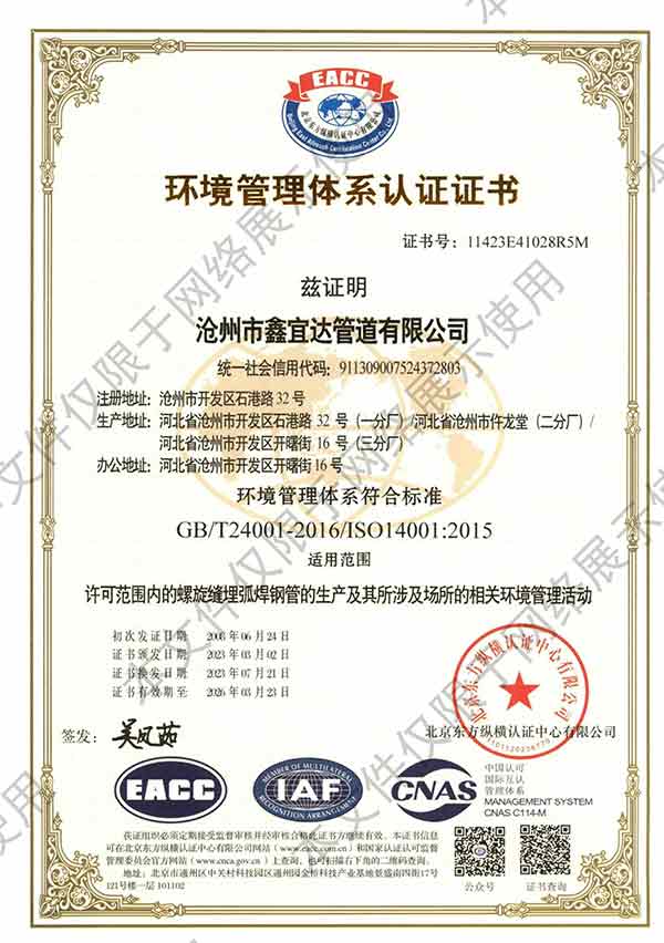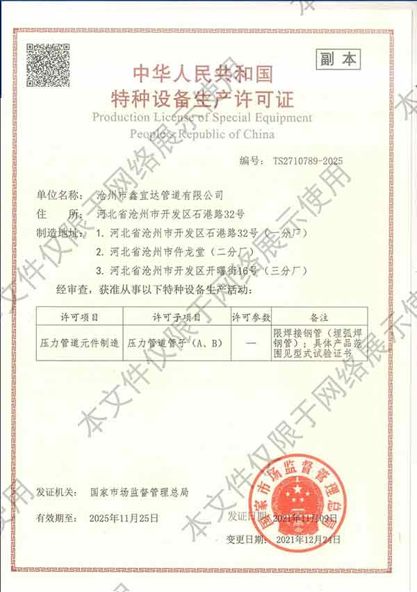 滄州市鑫宜達(dá)管道有限公司成立于2003年7月,坐落于滄州經(jīng)濟(jì)開(kāi)發(fā)區(qū),占地面積40萬(wàn)平方米,注冊(cè)資金1.81億元,是集螺旋鋼管生產(chǎn)、防腐加工以及無(wú)縫鋼管、卷板、帶鋼等品類(lèi)鋼材經(jīng)營(yíng)銷(xiāo)售于一體的工貿(mào)型企業(yè)。公司現(xiàn)有員工400多人,其中,中高級(jí)技術(shù)職稱的人員達(dá)120余名。 滄州市鑫宜達(dá)管道有限公司擁有9條螺旋鋼管生產(chǎn)線和3PE防腐生產(chǎn)線,可生產(chǎn)直徑219--3640mm,壁厚5.5--28mm,最高鋼級(jí)X100的各種規(guī)格防腐螺旋鋼管...